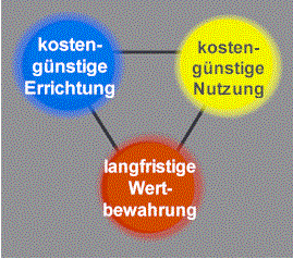 Bauen . die kostengünstige Errichtung, also das preiswerte Erstellen des Gebäudes, die kostengünstige Nutzung, also möglichst geringe Folgelasten für Betrieb und Instandhaltung während der Bewirtschaftungsphase und die langfristige Wertbewahrung, den inflationsneutralen Erhalt des investierten Kapitals, vorbeugend gegen Geldwertverfall.